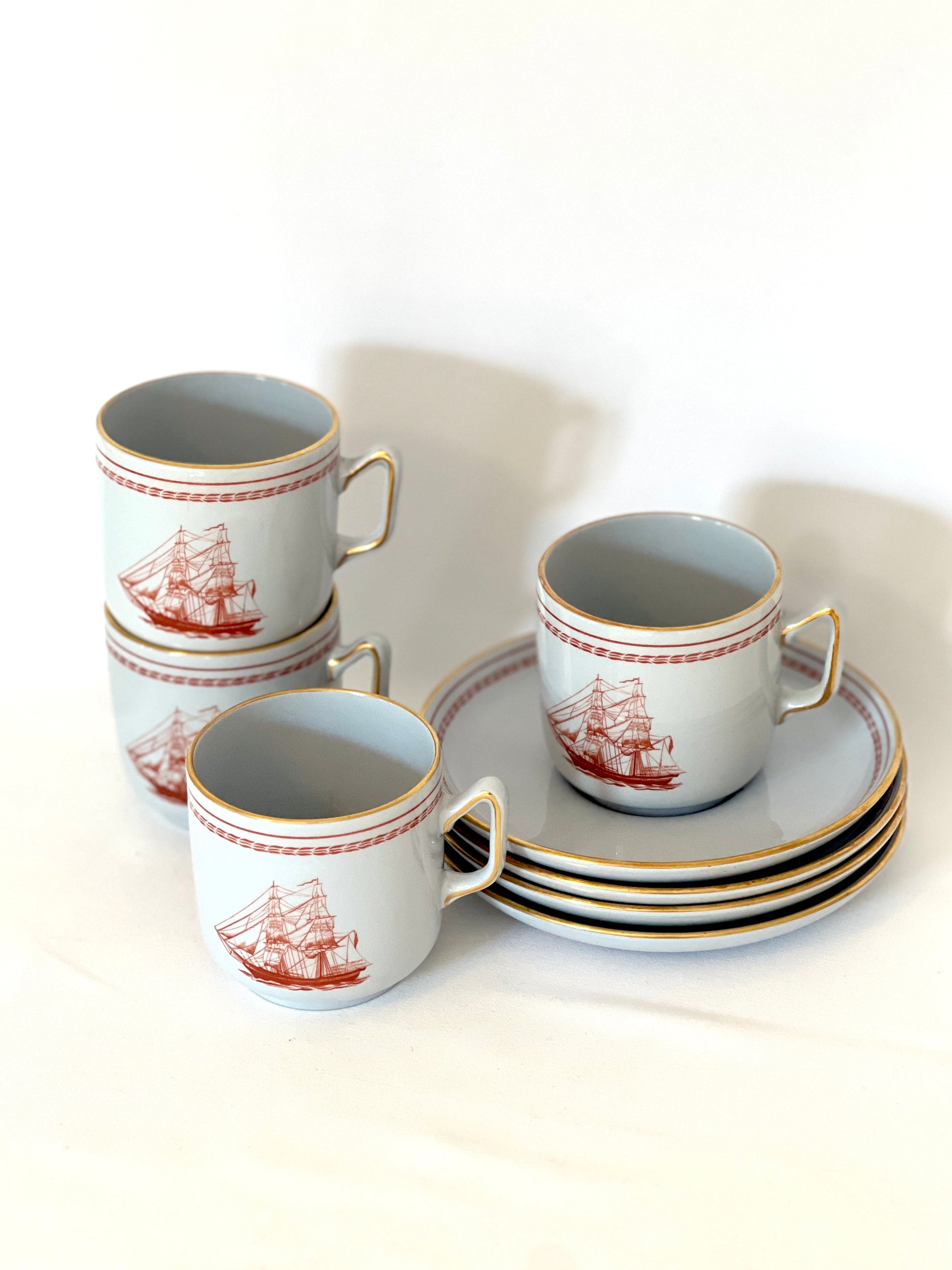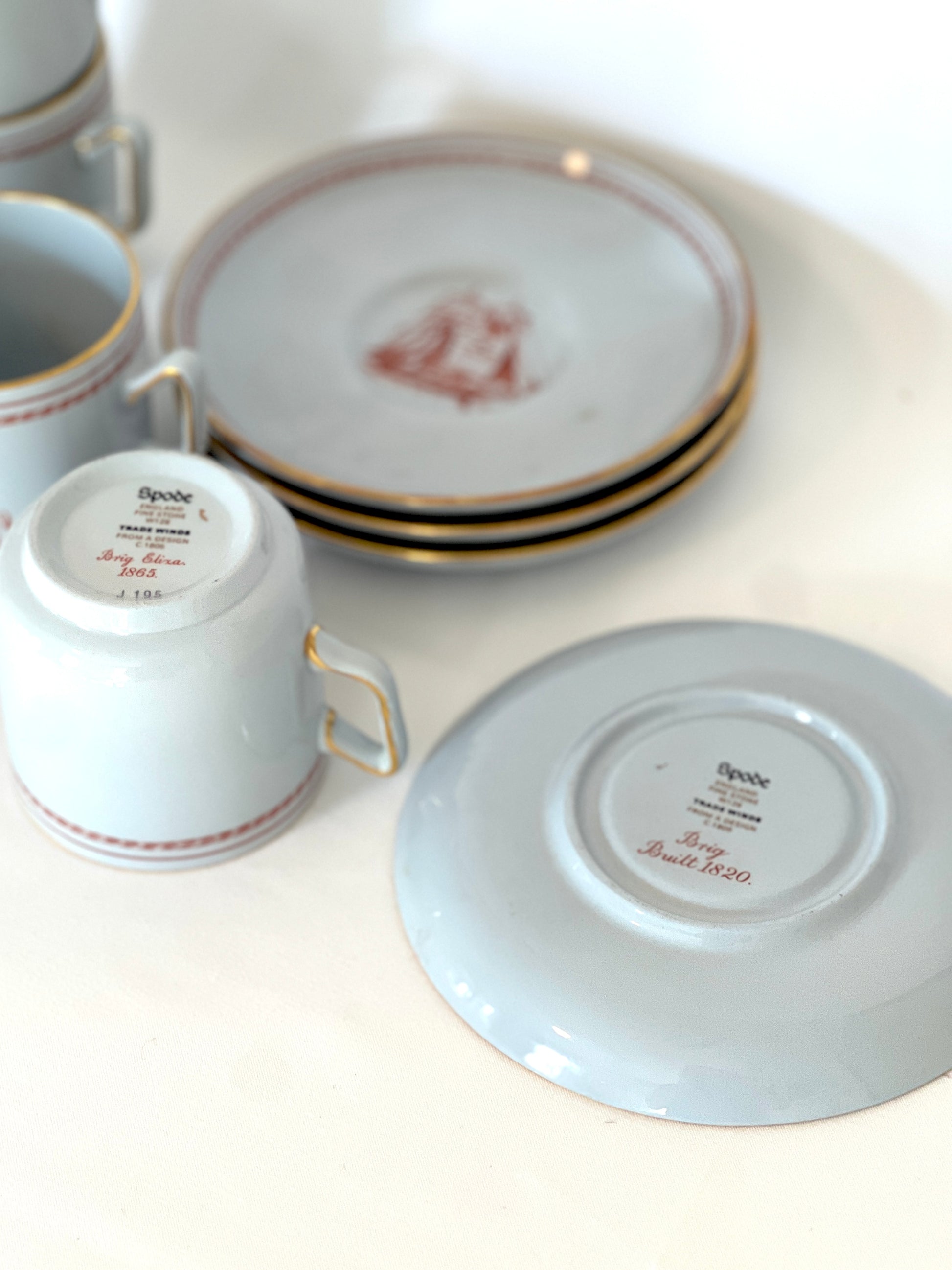 Spode Copeland Red "Trade Winds" porcelain demitasse cup and saucer set. Produced by Spode in England from 1962-1993. Ship depicted on cups is the "Eliza," built in 1865.